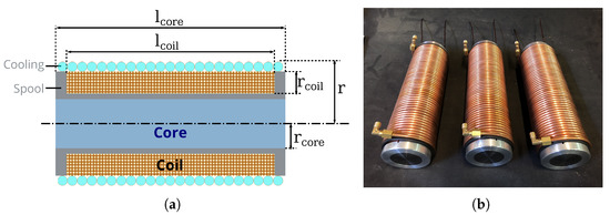 From these considerations, we chose the following design parameters to implement each electromagnet. The core was composed of low-carbon steel (C35, ThyssenKrupp AG, France) with and . Aluminum (a paramagnetic material that is essentially unaffected by the magnetic fields; Aluminum EN AW-2017a-en 573-3, ThyssenKrupp AG, France) spool is added to separate the core and the coil, and to keep the winding in the given space. This spool has an inner length of and a thickness of . The coil is composed of winding of six layers of copper wire (copper is a diamagnetic material, and thus is repelled by the magnetic field; Enameled copper wire, cl 200 degrees, grade 2. APX, France) of diameter of , leading to a thickness of and a number of turns . Finally, a cooling unit is placed around the coil winding. The cooling system consists of a circulating coolant liquid flowing through a copper tube with a diameter of . All these elements lead to an electromagnet with an overall size of , and an electromagnet prototype has been realized and is shown in Figure 9b.