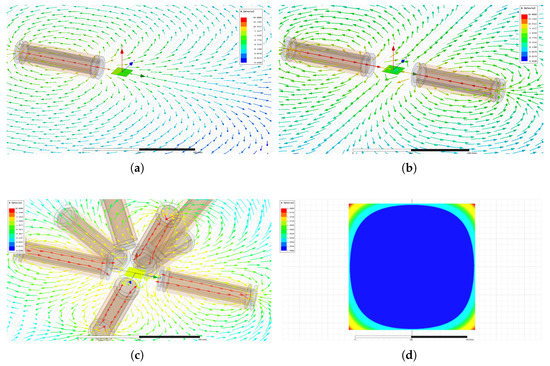 Magnetic field distribution using FEM: (a) a single- and (b) a dual-electromagnet system; and (c,d) the eight-electromagnet arrangement with and . (d) The magnetic field magnitude within the workspace.