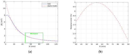 Comparison of simulation results for the FEM and point-dipole model along the x axis: (a) the magnetic field magnitude where the green box delimits the range of workspace, and (b) the relative error within the workspace.