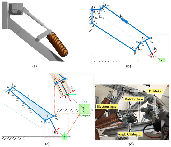Next, a motor actuates the joint , which rotates the following links – and the other joints –. Then, the electromagnet fixed to the link is able to rotate with .