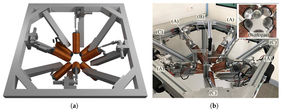 From the previous studies, either the OctoMag-like or the MiniMag-like configuration seems to be a proper arrangement solution to fulfill the OctoRob design specifications. In addition, the realized OctoRob system should be adaptable and adjustable in real-time with respect to the microrobotic task. The distance () and orientation () of each electromagnet are the most important parameters to be adjusted [3]. Specifically, the adaptation of the moving angle of a mobile coil set makes it possible to favor either the magnetic field or its gradient. That is why a kinematic mechanism should be devised in order to adapt in real-time the orientation of each movable electromagnet.