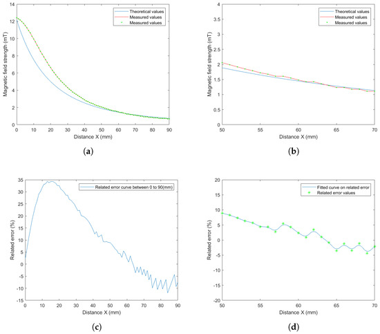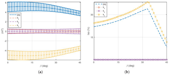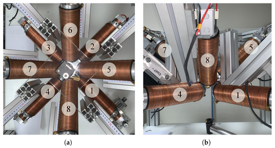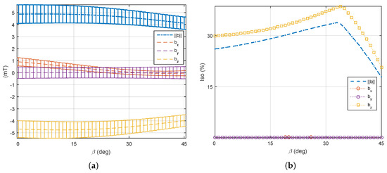 FEM modeling using ANSYS® Maxwell (https://www.ansys.com/products/electronics/ansys-maxwell accessed on 25 November 2022) software has been performed. Hence, the specified electromagnetic coils were modeled and simulated through finite element analysis (FEA). Figure 10 shows some simulation results where a current of is flowing in each electromagnet. Figure 10a,b illustrate the magnetic field where the workspace is surrounded by a single and a pair of electromagnet(s), respectively. Likewise, Figure 10c,d present the magnetic field distribution of the retained electromagnets’ configuration where the stationary coil set has an angle and the mobile coil set has an angle . Figure 11 shows the comparison between the FEM results and the point-dipole results along the x axis. Figure 11b reports the relative error on the magnetic field magnitude within the workspace. It appears that the point-dipole model is a convenient method to approximate the magnetic field distribution with a relative error less than in the OctoRob workspace.