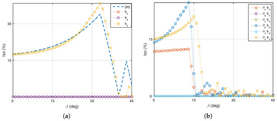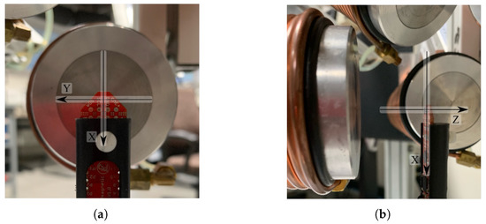 To determine the maximum value for every angle and , let us define the projection of the center of the electromagnet e in the -plane, as represented in Figure 7a. As one can see, each angle is defined as: