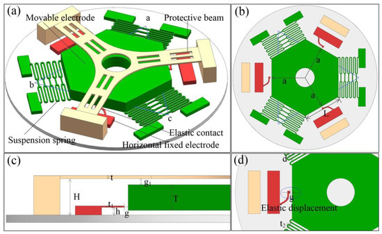The structure of the designed three-axis inertial switch is shown in Figure 1a. The main structure is composed of three parts. The hexagonal mass block connected to three sets of snake springs is designed as a movable electrode; the other ends of the springs are connected to the fixed block. The three fixed ends of the movable electrode form a triangular layout in three-dimensional space. Three fixed elastic electrodes are distributed on the edges of the hexagonal mass block, forming three sensitive directions that can be triggered. The structure with three fixed ends and another three movable sides determined three accurate, sensitive directions attributed to the triangle’s stability. The cross cantilever above the mass block can effectively restrain the bounce of the mass block in the Z direction. Figure 1b is the top view of the inertial switch, which shows the three sensitive directions. Figure 1c is the half of a side view of the structure. Figure 1d shows the elastic displacement between the mass block and fixed electrode. The main structural parameters of the designed inertial switch are shown in Table 1.