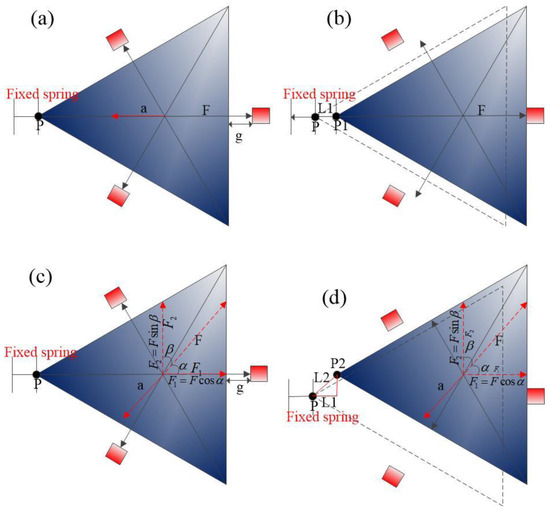 The schematic diagram of the contact process of the designed three-axis inertial switch is shown in Figure 2. According to , when the inertial switch is shocked in a sensitive direction, the proof mass moves towards the fixed electrode, which is attributed to the action of force F, as shown in Figure 2a. Furthermore, the direction of the force is opposite to the direction of the acceleration. Then, one end of the proof mass moves from point P to P1; the spring is stretched L1, and L1 = g, as shown in Figure 2b. When the inertial switch is shocked in the direction of deviation from the sensitive direction α, as shown in Figure 2c, the angle between the direction of the force and the sensitive direction is α, and the proof mass moves towards the fixed electrode attributed to the action of force F1. According to the vector decomposition method, one can obtain , . The proof mass moves towards to fixed electrode in a sensitive direction if the angle , the movable electrode contact with the fixed electrode attributed to the force of F1, as shown in Figure 2d. At this moment, one end of the movable electrode moves from point P to point P2, and the spring elongation is L2. As can be seen from Figure 2d, the length of L1 is equal to the gap between the movable electrode and the fixed electrode, and the length of L2 is far greater than L1.