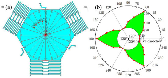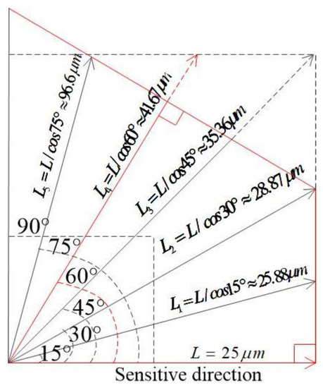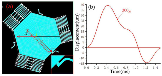 According to the law of trigonometric row functions, we can obtain . When the direction of impact acceleration deviates from the sensitive direction of the inertial switch by 15°, 30°, 45°, 60°, and 75°, the displacement of the movable electrode is 25.88 μm, 28.87 μm, 35.36 μm, 41.67 μm, 96.6 μm, respectively. Because in the hexagonal structure, the angle cycle is 60°, in this design, the maximum deviation of the angle is 60°. The schematic diagram of the displacement of the proof mass is shown in Figure 3.