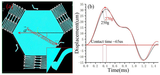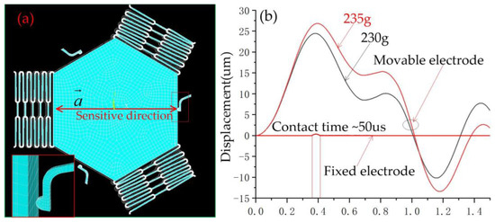 The dynamic contact process was simulated by ANSYS finite element analysis software, and the finite model (FE) is shown in Figure 4. The model’s structure parameters are shown in Table 1. The ends of the springs and fixed elastic electrodes wee constrained to zero degrees of freedom. The nickel (Ni) electroplated by surface micromachining technology was selected as the structure, the material parameters of Young’s modulus and density were chosen to be 165 GPa and 8.96 g·cm−3, respectively [16]. To investigate the threshold of the designed three-axis inertial switch, the 230 g and 235 g accelerations with a pulse width of 1 ms were applied to the FE model in a sensitive direction, as shown in Figure 5a; the dynamic response curves of proof mass are shown in Figure 5b, which indicates that the displacement of proof mass decreases with the decrease of the peak acceleration. The displacement is about 26 μm when the acceleration is 235 g and the movable electrode contacts the fixed electrode, as shown in Figure 5a. Therefore, 235 g can be judged as the threshold acceleration. The dynamic contact process was obtained, which indicates that the response time is about 3.5 ms and the contact time is about 50 μs, as shown in Figure 5b.