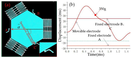 Figure 9 shows that when 350 g acceleration was applied to the direction opposite to the sensitive direction (direction A), the movable electrode contacted the fixed electrodes B, and C, as shown in Figure 9a, but the fixed electrode did not show elastic deformation, and the contact time did not extend, as shown in Figure 9b. It also shows that when overload acceleration is applied in the opposite direction of the sensitive direction, the flexible electrode with elastic recovery will not be in contact with the fixed electrode in the sensitive direction.
