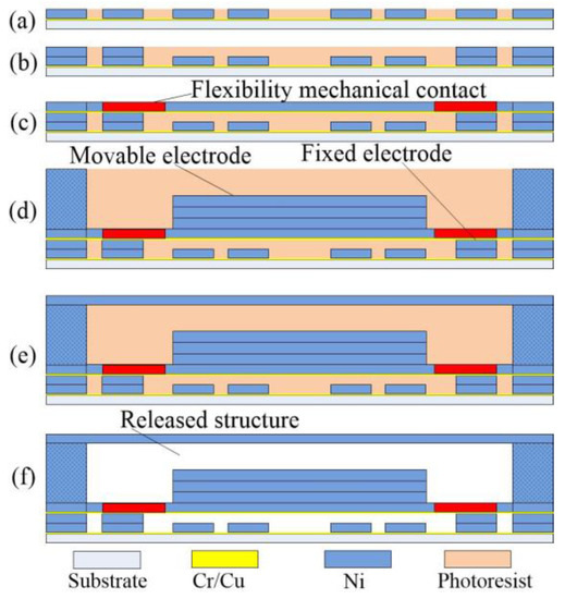 (a) The chrome–copper conductive layer was prepared by magnetron sputtering. the bottom fixed electrode pattern was casted by photoresistance on the chrome–copper thin-film, and the Nickel-metal strips were prepared on the seed layer.