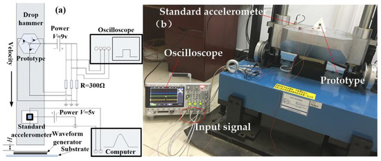The prototype was tested by a dropping hammer system (SuShi, SuZhou, China), and the test schematic diagram is shown in Figure 13a; the testing equipment is shown in Figure 13b. The prototype was fixed on the fixture, fabricated by 3D-printing technology. The prototype and standard acceleration were fixed on the objective table. One of the sensing directions of the device is perpendicular to the vibration plane. The electrodes in three sensitive directions were simultaneously connected with the signal input interface of the oscilloscope. When the acceleration reached the threshold value of the testing device, the inertial switch was activated, and the trigger signals were captured by the multi-channel oscilloscope.