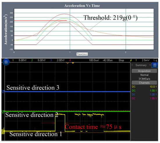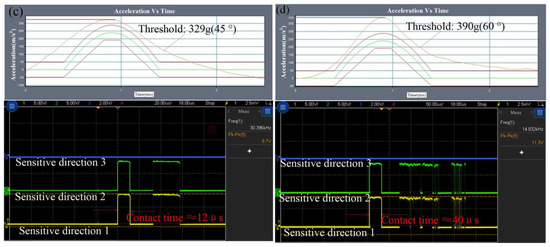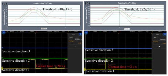 The test result of the threshold in the sensitive direction is shown in Figure 14, which indicated that the threshold is about 219 g and the contact time is about 75 μs. The threshold is about 248 g in 15 degrees away from the sensitive direction, and the first contact time is about 20 μs, as shown in Figure 15a. The threshold is about 282 g, 329 g, and 390 g, and the contact time is about 2 μs, 12 μs and 40 μs when the applied acceleration is away from the sensitive direction by 30°, 45°, and 60°, respectively. The tested results are shown in Figure 15b–d, respectively.