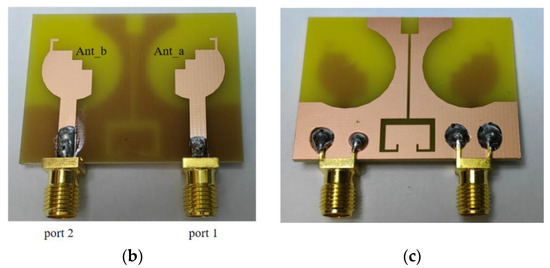 The configuration and prototype of the designed dual-band antenna are shown in Figure 1. The radiator of the antenna element consists of an L-shaped strip and a defective circular radiator composed of a semicircle with step-shaped strips. The radiator is fed by a 50 Ω micro-strip feedline. Two identical antenna elements are printed on a 1.59 mm thick FR4 substrate with relative permittivity of 4.4 and loss tangent of 0.02. A cambered ground plane is printed on the bottom of the substrate. High isolation is achieved by etching a C-shaped slot, a rectangular slot, and a rectangular slit. Through simulation and optimization, the detailed parameters are shown in Table 1.
