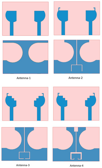 Figure 2 presents the detailed process for the proposed antenna to study the performance of the 5G dual-band monopole antenna. Because two antenna elements are placed symmetrically to share the ground plane, S11 and S21 are the same as S22 and S12, respectively. For simplicity, we only discuss S11 and S21. The simulated S-parameters are plotted in Figure 3. In Antenna 1, a three-quarters circular radiation patch with the circular slotted ground plane is designed. Antenna 1 can achieve a −10 dB impedance bandwidth of 500 MHz (2–2.5 GHz) and 1880 MHz (4.05–5.93 GHz). However, the isolation between the radiating elements is non-ideal over the operation bands, which is illustrated in Figure 3b. In Antenna 2, an L-shaped branch is designed to realize a lower frequency shift (right) and a higher frequency shift (left), which can be seen in Figure 3a. By adding an inverted U-shaped slot and an I-shaped slot on the back side, it can reduce the mutual coupling between the antenna elements. In addition, as shown in Antenna 3, introducing the step-shaped radiating elements can realize useful impedance bandwidth. The result indicates that the impedance bandwidth covers 2.33–2.68 GHz and 3.93–5.13 GHz, and the value of S21 adjacent to the defected ground structure decreases to below −24 dB and −17 dB in the 2.5 GHz and 4.5 GHz bands, respectively. Finally, a T-shaped slot and a G-shaped slot are incorporated at the bottom plane to reduce the mutual coupling to below −15 dB for the entire frequency band.