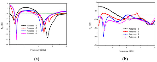 Furthermore, it is also challenging to design a multi-band MIMO antenna to meet substantial wireless communication bands because the same isolation method may not work at different frequency bands. Recently, several dual-band MIMO antennas have been proposed [9,10,11,12,13,14,15,16,17,18,19,20]. In [9], a dual-notched four-element MIMO antenna with dual-band characteristics has been proposed by introducing gap sleeves and an H slot. It covers the frequency bands of 3.3–4.1 GHz and 8.2–8.6 GHz. A dual-band MIMO antenna was proposed in [10] by implementing an L-shaped feeding strip, a parasitic rectangle strip, and a modified Z-shaped radiating strip. In [13], an eight-element MIMO antenna was designed to meet the requirement of the 5G mobile terminals. A quad-element MIMO antenna with E-shaped and G-shaped stubs was presented to achieve two resonances at 1.5 GHz and 2.45 GHz, respectively in [18]. In [20], a MIMO antenna array was realized which can cover the 5G NR Bands n77/n78/n79 and WLAN 5 GHz band.