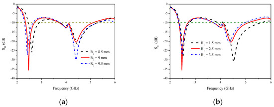 Reflection coefficients of the proposed MIMO antenna (a) with different values of R2 and (b) with different values of H1.