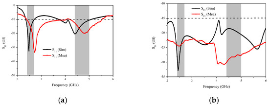Figure 6 presents the simulated and measured S-parameters results for port 1, including S11 and S21. It is exhibited that the measurement results are different from the simulation results because of SMA soldering and unavoidable tolerances in the fabrication and measurement process. To be specific, it is observed that the measured −10 dB impedance band can cover the n7 (2.5–2.69 GHz), n38 (2.57–2.62 GHz), n41 (2.496–2.690 GHz), and n79 bands (4.4–5 GHz) in Figure 6a. From the transmission curves, it can be seen that S21 is below −20 dB over the whole operating frequency band (2.0–6.0 GHz).