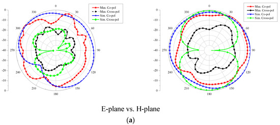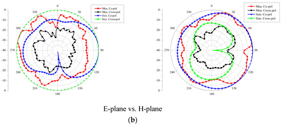 To study the radiation mechanism of the antenna in-depth, Figure 7 presents the measured far-field radiation patterns in the H-plane and the E-plane at 2.5 GHz and 4.7 GHz, respectively. During the measurement and simulation, one port is excited, while the other one is matched with a 50 Ω load terminal. The proposed antenna has nearly stable omnidirectional radiation patterns in the H-plane at 2.5 GHz and 4.7 GHz. At 2.5 GHz, the E-plane is shown as a bidirectional model, while the radiation patterns appear deformed in the E-plane at 4.7 GHz. There is no effect on the radiation performance.