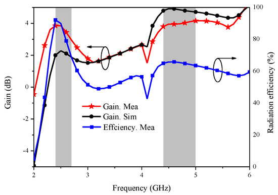 Gain, as one of the critical parameters of the antenna, is used to measure the antenna’s ability to receive and transmit signals. Figure 8 shows the gain and radiation efficiency of the proposed MIMO antenna. It is presented that the peak gain of the proposed antenna is around 3 dBi for the 2.5 GHz band, and it is around 3.8 dBi for the 4.7 GHz band, while the measured radiation efficiency is higher than 62% and 66% in the operating bands, respectively.