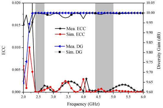 Measured and simulated ECC and DG of the proposed two-element MIMO antenna.