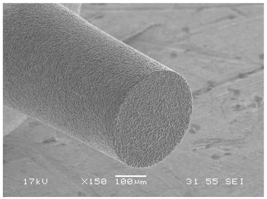 Figure 1 shows the experimental setup for the microgrinding process. The system consisted of an X–Y–Z stage, a high-speed spindle, and a dynamometer (9256C2, Kistler Instrumente AG, Winterthur, Switzerland) for measuring the cutting forces [10,11]. As a workpiece material, fused silica was used. The workpiece was a 15 mm × 15 mm plate with a thickness of 1 mm that was fixed on the dynamometer. Before the experiment, the spindle was operated for several tens of minutes to ensure a steady-state temperature distribution in the spindle system. Table 1 shows the properties of the fused silica. The system also had a wire electrodischarge grinding (WEDG) module for fabricating microtools. WEDG is one of the electrical discharge machining (EDM) methods using wire and can be used to fabricate microtools of various shapes [16]. An RC-type circuit consisting of resistors and capacitors was used as an EDM circuit. As the tool material, polycrystalline diamond (PCD) was used. Since PCD has a high hardness, it is suitable as a tool material for machining brittle materials such as glass, ceramics, cemented carbide and silicon carbide [17]. In this experiment, a microgrinding tool with a diameter of 300 µm fabricated via WEDG was used. Figure 2 shows an example of the PCD microtools. The surface roughness of the workpieces was measured using a laser confocal microscope (OLS5000, Olympus Corp., Tokyo, Japan). The average roughness (Ra) was used as a surface roughness parameter [18].