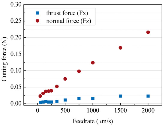The cutting forces according to the different feed rates (feed rates: 10–2000 µm/s; depth of cut: 5 µm; 50,000 rpm).