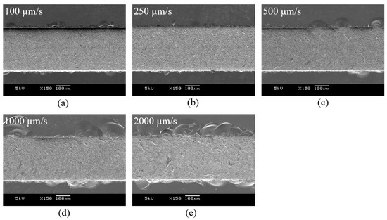 SEM images of the channels with different feed rates (a) 100 µm/s, (b) 250 µm/s, (c) 500 µm/s, (d) 1000 µm/s, (e) 2000 µm/s (depth of cut: 5 µm; 50,000 rpm).