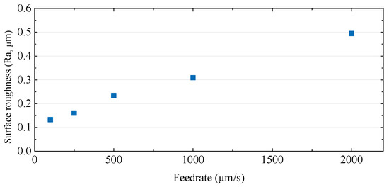 The surface roughness values of the channel bottoms according to the different feed rates (feed rates: 10–2000 µm/s; depth of cut: 5 µm; 50,000 rpm).