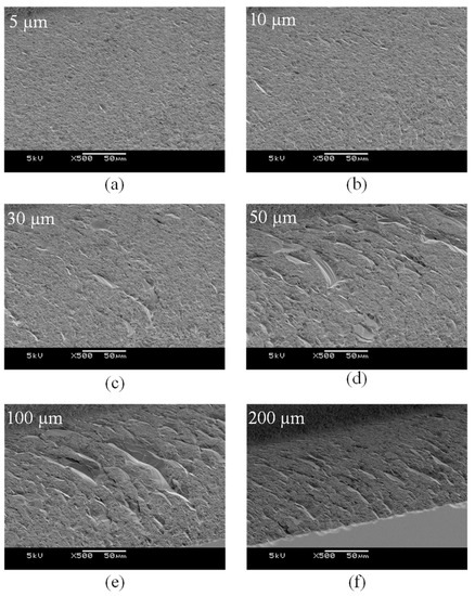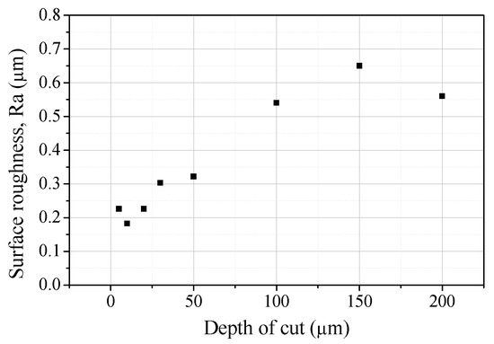 Since a depth of cut is a major factor affecting the material removal rate, the effect of the depth of cut was analyzed. The feed rate was set to 250 µm/s and the tool’s rotational speed was set to 50,000 rpm, while the depth of cut increased from 5 µm to 200 µm.