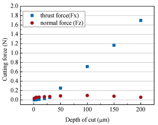 Figure 8 shows the change in cutting force according to the depth of cut. When the cutting depth was less than 30 µm, both the normal force and the cutting force were less than 0.1 N, but when the depth was greater than 50 µm, the cutting force became greater than the normal force. This was the effect of the size of the edge radius described above.