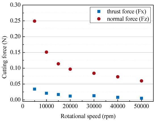 In general, microtools require a high rotation speed because they have a small diameter and a low cutting speed. Figure 9 shows the changes in cutting force according to the rotational speed of the tool. As expected, the higher the rotational speed, the lower the cutting force. A high rotational speed of more than 30,000 rpm is required for a small cutting force of 0.1N, but this is also affected by other cutting conditions.