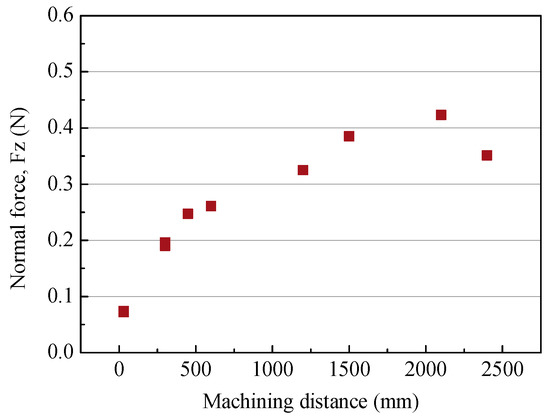 When tool wear occurs, the cutting force increases and the microtool can break. To analyze the tool wear characteristics, the cutting force and tool surface changes according to the machining distance were compared. A channel with a length of 2400 mm was machined under the conditions of a tool feed rate of 250 µm/s, a cutting depth of 5 µm and a tool rotational speed of 50,000 rpm. As the cutting length increased, the normal force continuously increased, as shown in Figure 10. Figure 11a,b show the tool before and after machining. It can be seen that the edge radius increased from 2.9 µm to 5.2 µm due to wear on the tool edge. Wear also occurred on the bottom surface near the edge of the tool. Figure 11c shows wear on the bottom surface of the tool edge. The rough surface generated via EDM was flattened by abrasive wear.