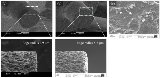 SEM images of a tool edge (a) before and (b) after machining and (c) abrasive wear on the tool’s bottom surface.