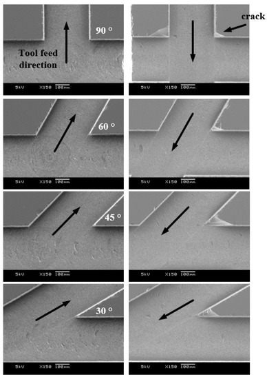 In general, microfluidic chips are composed of several branch channels used for injecting two or more fluids, and the angles between the channels are also varied. Micromixers, one of the applications of microfluidic chips, have several branch channels, and the lengths and angles between channels are very important for the efficiency of the fluid mixing [20,21,22]. When machining branch channels using microtools, the sizes of the cracks vary depending on the tool feed direction. To confirm this, branch channels with 30, 45, 60 and 90° angles were machined in different tool feed directions and cracks were observed, as shown in Figure 12. In the figure, the horizontal channel was machined first, then the branch channel was machined. As the tool moved from the first machined horizontal channel to the branch channel, the crack was suppressed at any angle. This was because compressive stress rather than tensile stress acted on the material in the channel. Therefore, it is necessary to generate tool paths considering the occurrence of cracks when machining branch channels.