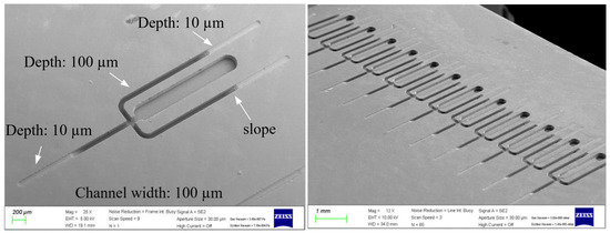 SEM images of microfluidic chip arrays with different channel depths (tool diameter: 100 µm; feed rate: 150 µm/s; channel depths: 10 and 100 µm).
