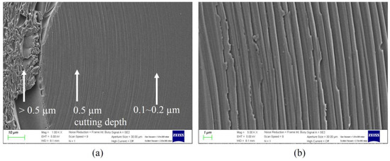 Although cracks occur at the channel bottom, the surface quality can be improved and the roughness can be reduced to 0.067 µm Ra using post-processing methods such as laser polishing [23]. When the depth of cut is extremely low, a surface without cracks and with excellent surface quality can be obtained. However, since the depth of cut should be lower than 1 µm, more research on this is needed to improve the productivity. Figure 15a shows the machined surfaces according to the cutting depth, and at a cutting depth of 0.5 µm or less, as shown in Figure 15b, the surface was machined in ductile mode. The average roughness was 0.017 µm Ra.