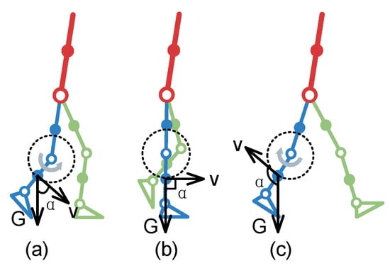 By analyzing the structure of lower limbs, their working joints can be divided into the hip, knee, and ankle. Each moving joint can be used as the object of energy collection. The gravity balance state is shown in Figure 2. It focuses on the movement of the lower limb and simplifies the upper limb. The red rod represents the upper limb, the blue rod represents the right lower limb, the green rod represents the left lower limb, the hollow circle represents the movable joint, and the solid circle represents the center of mass for the rod. During walking, the human body is constantly undertaking positive and negative work to overcome gravity. The direction of gravity at the shank is vertically downward, and the direction of speed is perpendicular to the shank and points to the direction of motion. The angle is the angle between the direction of gravity and the direction of velocity . The work performed by lower limb joints can be described using three cases: (1) at , the lower limbs are stretched and perform positive work (Figure 2a); (2) at , the lower limbs stand upright without performing work (Figure 2b); (3) at , the lower limbs perform flexion and negative work (Figure 2c).