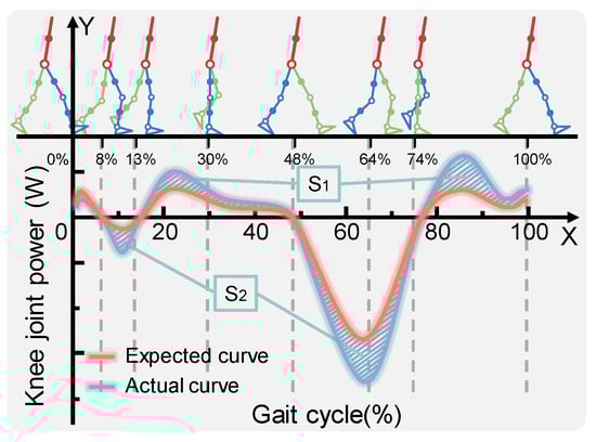 In Figure 3, the fitting curve of average knee power in a gait cycle is shown. Six typical postures of the knee joint are selected at the top of Figure 3 (see Table 1) and compared with the average power fitting curve at the bottom. Within this figure, the horizontal X-axis represents a complete gait cycle (%), the vertical Y-axis represents the knee power (W), the blue line represents the original average power curve , and the red line represents the expected average power curve after assistance. The difference between these two fitting curves is represented by the shadow composed of 45° oblique lines, and the shadow area above and below the horizontal axis is represented by and respectively.