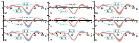 Power changes during assisted walking. Two conditions of joint power are described: an expected curve (red) and actual curve (blue). The area formed between the two curves is indicated using red (above the X-axis) and blue (below the X-axis) slashes respectively. When parameter is a negative number, is (a) positive, (b) 0 and (c) negative. When parameter is equal to 0, is (d) positive, (e) 0 and (f) negative. When parameter is a positive number, is (g) positive, (h) 0 and (i) negative.
