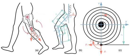 In the new design of the exoskeleton, scroll springs are used for gravity compensation. According to the energy conservation theorem, in order to realize gravity compensation during walking, the total potential energy of the human exoskeleton system, including spring and gravity, must be constant. Figure 5a shows the coupling model of the human exoskeleton system.