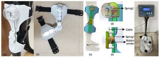 Figure 6 shows an overall view of the knee exoskeleton worn on the human body. The fixation of the exoskeleton is mainly composed of two parts. Coil springs are installed at the thigh and knee joints, respectively, to assist with inelastic deformation. These two parts are attached to the rigid support frame and connected with the flexible part to prevent wear on the human body. Coil spring 1 is driven by the movement of the shank, and coil spring 2 is driven by an inelastic cable called the transmission cable connected with the movable shaft of coil spring 1.