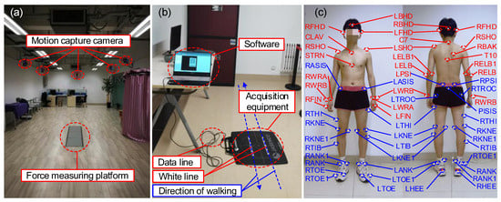 In the three-dimensional motion acquisition experiment (Figure 9a), in order to avoid the marker ball from being blocked by clothes, the participant wore tight shorts and was shirtless to improve the accuracy of experimental data. Before the start of the walking experiment, it was required that static data be collected from the participant. The participant stepped on a three-dimensional force measuring board with their legs separated, and kept their arms extended. Then, the participant was asked to walk in a straight line along a prescribed route of about 5 m according to their own habits, and step on the three force plates with their two legs one after another. During each walk, the participant adjusted their pace according to the metronome rhythm, in order to ensure that the experimental pace was uniform. The participant walked straight from the force plate and returned to the starting point of the previous walk, which counted as one walk cycle. Gait segmentation was achieved by measuring the ground reaction forces. Each walking task collected 50 walking cycles, with a rest interval of about 2 min between each walking cycle. Large fluctuations were avoided in collected kinematic and dynamic data due to experimental fatigue. We tried to ensure that the participant’s natural gait was retained during the experiment.