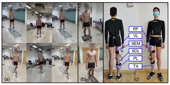 In the process of a human wearing experiment, the exoskeleton can be evaluated more comprehensively by analyzing muscle activity. We considered the function of the muscle, the depth of the muscle surface, and the position of the muscle. Delsys wireless surface electromyography test equipment was used in the experiment. The rectus femoris (RF), vastus lateralis (VL), semitendinosus (SEM), tibialis anterior (TA), peroneus longus (PL), and soleus (SOL) muscles were selected for the test and analysis to evaluate the assistance effect of the exoskeleton (Figure 9c). First, hair on the skin’s surface was removed using a depilator. Secondly, the skin was wiped with 75% medical alcohol. Finally, the skin’s surface was polished to remove the cuticle. The direction of electrode placement was parallel to the direction of muscle fiber, and the electrode was fixed using electrode paste. In order to prevent the EMG block from loosening and falling off during the exercise, the EMG block was wrapped with a skin membrane and the surface EMG signal was recorded.