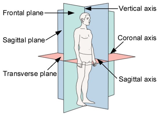 Based on the background of anatomical concepts, the three basic planes and three basic axes of human motion (see Figure 10) are briefly explained. The three basic planes are the sagittal plane, frontal plane, and horizontal plane []. The three basic axes are sagittal, frontal, and vertical. Among them, the frontal plane is composed of the coronal axis and vertical axis, which divides the human body into its front and back parts. The transverse plane is composed of the sagittal axis and coronal axis, which divides the body into its upper and lower parts. The sagittal plane is composed of the sagittal axis and vertical axis, which divides the body into its left and right parts, and it is also the only symmetrical plane. In the normal walking process of the human body, walking movement mainly occurs in the sagittal plane, and there is little to no movement in the frontal and horizontal planes. Therefore, when designing a lower limb-assisted exoskeleton robot, the flexion/extension motion of each joint is the primary goal for consideration. On this basis, we only selected effective data of the sagittal motion for processing and analysis.