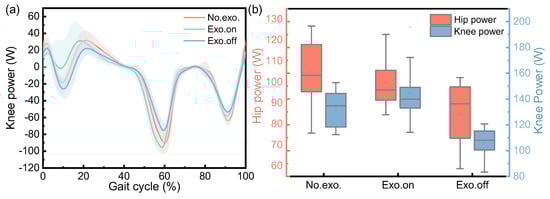 Figure 11 shows the changes in the hip knee power of participants in walking tasks, including changes in their hip knee power from the first heel’s contact to the second heel contact of healthy participants in three walking tasks (Figure 11a); a box diagram of the change range in hip knee power for a complete gait cycle is also shown (Figure 11b). It can be clearly seen from Figure 11a that the first peak, second valley and third valley of knee power in the “Exo. on” state were less than those in the “Exo. off” state and were reduced by about 41.55%, 25.83% and 6.87% respectively. During the second peak and the first valley of knee power, the state of “Exo. on” increased by about 16.31% and 94.65%, respectively, compared to the state of “Exo. off”, and the third peak was almost the same. It can be clearly seen from Figure 11b that for the state of “Exo. on”, the variation range in the hip and knee power was greater than that of “Exo. off”, and the average value of the variation range in hip and knee power increased by about 21.13% (n = 39 groups; one-way repeated-measures ANOVA; F = 8.355, p = 0.001; LSD post hoc analysis: p = 0.005) and 39.07% (n = 39 groups; one-way repeated-measures ANOVA; F = 18.609, p < 0.001; LSD post hoc analysis: p < 0.001), respectively. For the “Exo. off” state, the variation range in hip and knee power was less than that of “No exo.”, and the average value of the variation range in hip and knee power was reduced by about 21.60% (LSD post hoc analysis: p < 0.001) and 21.69% (LSD post hoc analysis: p < 0.001), respectively.