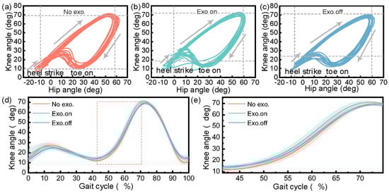 Participant’s hip–knee angle in the walking task. The hip–knee angle during the walking task for (a) “not wearing exoskeleton” (No exo.), (b) “wearing exoskeleton with assistance“ (Exo. on), and (c) “wearing exoskeleton without assistance” (Exo. off). (d) The change curve for the knee joint angle in a complete gait cycle. (e) Change in knee angle for 40~74% gait cycle (knee flexion to the maximum angle).