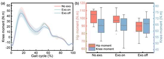Variation in joint moment of participant during the walking task. (a) The change in knee moment for three conditions during the gait cycle. (b) The variation range of the hip and knee moment for three conditions.