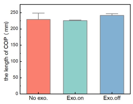 Figure 14 shows the variation in plantar pressure for the participant in walking tasks, which is a bar graph for the moving length of the plantar pressure center in three walking tasks. It can be clearly seen from the figure that for the state of “Exo. on”, the moving length of the plantar pressure center was less than that of “Exo. off”, and the moving length of the plantar pressure center was reduced by about 6.57% (n = 15 groups; one-way repeated-measures ANOVA; F = 4.982, p = 0.027; LSD post hoc analysis: p = 0.011). For the “Exo. off” state, when the moving length of the plantar pressure center was greater than that of “No exo.”, the moving length of the plantar pressure center increased by about 5.38% (LSD post hoc analysis: p = 0.038).