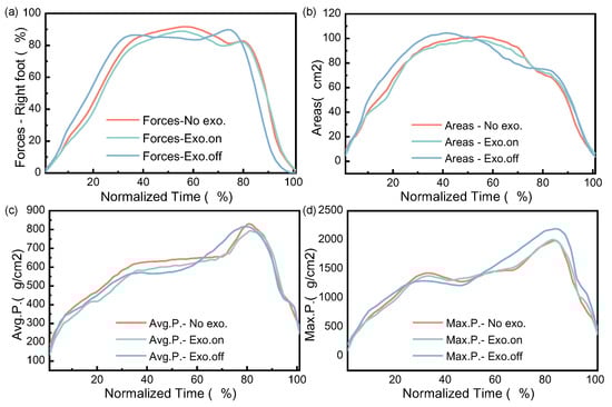 Figure 15a–d shows the variation diagram of the plantar force, area and pressure for the participant in the walking task. All data were time-normalized to 101 data points. Five groups were tested in each of the three states. The experimental data show that for the state of “Exo. on”, the plantar force, contact area, average pressure peak and maximum pressure peak were less than “Exo. off”. For the “Exo. off” state, the plantar contact area and the maximum pressure peak were greater than that of “No exo.”, while the plantar force and average pressure peak were less than that of “No exo.”. Through statistical analysis (one-way ANOVA), the experimental results were not significant (p > 0.05), which shows that the previous hypothesis is not tenable. Therefore, the wearing of the exoskeleton had no effect on the changes in the plantar force, area and pressure of participants. In the follow-up, we continue to study the effect of wearing the exoskeleton on plantar parameters.