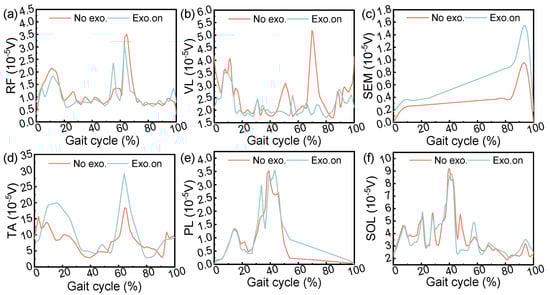 Muscle activation. These curves represent two different conditions: “No exo.” (red) and “Exo. on” (cyan). During the gait cycle (heel to heel contact), the active state of six tested muscles was analyzed, including (a) the rectus femoris, (b) vastus lateralis, (c) semitendinosus, (d) tibialis anterior, (e) peroneus longus, and (f) soleus muscle.