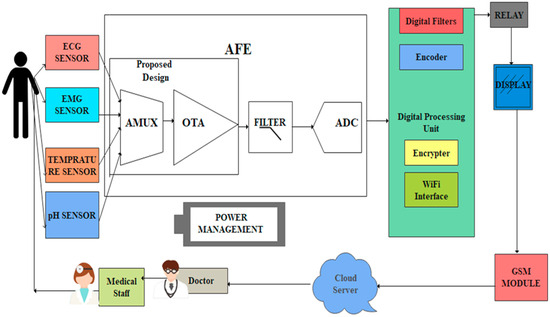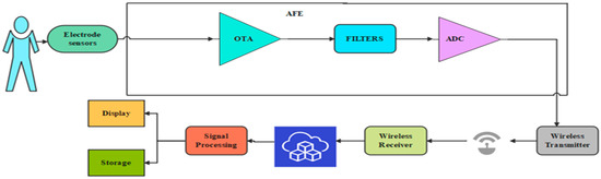 An essential part of a WMD is shown in Figure 1. This wrist-worn device measures all biological signals with a 2 mW power consumption and a 1.2 V power supply [15]. With the help of wearable sensors, abnormal signals can be detected quickly, and medical aid can be provided promptly [16]. The constant electrode or sensor placement dramatically depends on the area where the biological signal is gathered from the skin surface [17]. An AFE primarily consists of amplifiers, filters, and analog-to-digital converter (ADC) blocks. Input voltages from electrode sensors are detected, amplified, filtered, and pre-processed by the amplifier and filter blocks. The output voltage is then converted into a digital signal by an ADC, which then transmits the signal to a transmitter [18]. A smartphone or comparable device receives the transmitted signal for real-time viewing. The data will then be sent to the cloud for additional processing and reporting to nearby physicians.